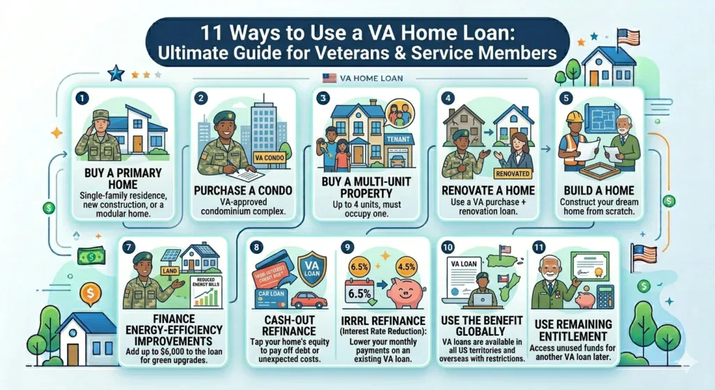 Learn how to use VA home loan benefits to buy, build, refinance, or improve a home. This comprehensive guide covers eligibility, step‑by‑step strategies, tables, FAQs, and expert tips — all written in a natural, human tone with strong SEO.